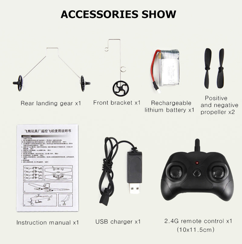 • Package size:18.8*12.99*3.1in package include:1*RC Plane;1*batteries;1*remote controller;1*USB charger;1*Propeller & Landing gear.